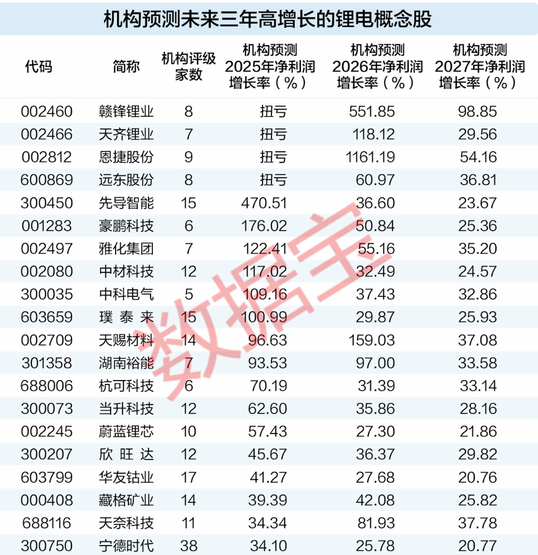 在动力电池持续增长、储能电池需求超预期背景下,机构持续看好锂电池概念股未来前景。根据10家及以上机构一致预测,25股2025—2027年归母净利润增长率有望超过20%财牛股配,包括宁德时代、赣锋锂业、藏格矿业、华友钴业4家市值千亿元的龙头股。